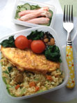 おかずには、オムレツと、カニときゅうりの酢の物、豆昆布、菜っぱ、トマトが入っています。