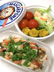 作り置きして冷凍しておいたラビオリをお弁当にしました。ソースはエビ、イカ、トマトをオリーブオイルで炒めて、白ワイン少々を入れて煮詰め、塩こしょうで味付けしてます。付け合せのカボチャの煮付けは、茶巾しぼりにしようかなと思ったのですが、お花の抜き型に詰めてカワイクしちゃいました。ポテトサラダとプチトマトを添えて、青じそがたっぷりあるので、贅沢にも野菜の下に敷いて使ってます。