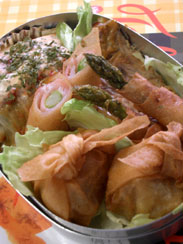 うちはIHクッキングヒーターを使っているのですが、揚げ物をするときは、オートマティックで温度を保ってくれるのでとても便利です。母が作る夕食の揚げ物のついでに、お弁当用の春巻を揚げさせてもらいました。アスパラガスとハムをスティック状に巻いたもの、そして冷凍シュウマイを茶巾のように包んだものの2種です。