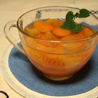 - 3を型に流し入れる。果肉の汁が残っていると部分的に固まらなくなるので、ゼリーとよくかきまぜておく。冷蔵庫で冷やし固める。