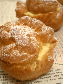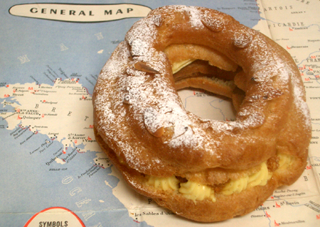 余った生地で「パリ=ブレスト」と「シュークリーム」、チョコクリームを詰めた「エクレア」も教わりました。分かる人には分かるでしょうが、これもすっごいいびつです。フランスの地図のパリとブレストの間にちょうど収まっております。